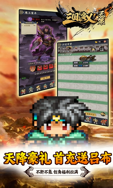 从汉中之战的滚滚硝烟启程,您将亲历从无名小卒到一方雄主的崛起之路。招募各怀绝技的豪杰义士:有勇冠三军的猛将冲锋陷阵,有运筹帷幄的谋士布局天机,更有身负奇技的游侠暗藏杀招。数十种独门技能与百变装备组合,让每一场战役都成为策略的狂欢。