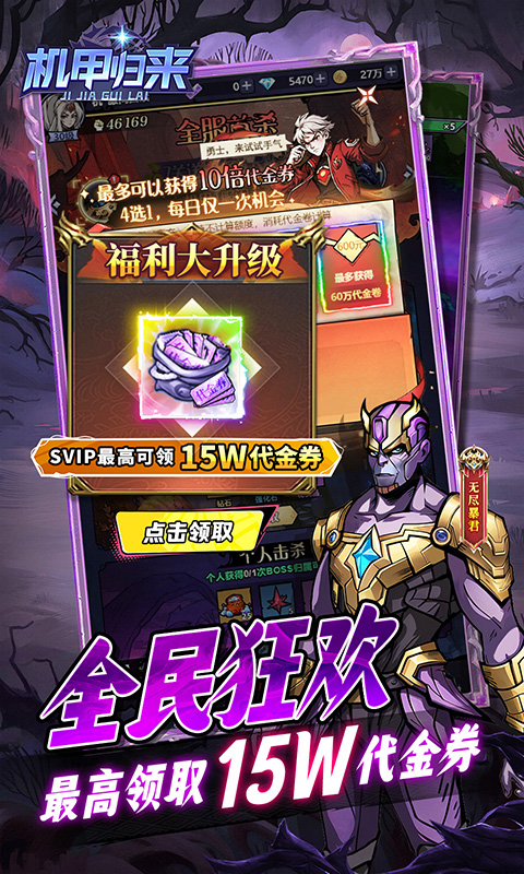 《机甲归来》是一款充满美漫风格的MMO挂机游戏,它以精彩的特效和丰富的玩法为核心,带你进入一个前所未有的机甲战斗世界。游戏内,充值仅需0.1折的超值优惠,让你充值648元仅需6.48元,同时享受代金券最高10倍膨胀的福利。创角即送豪华大礼包,包括铸魂石、魔力、宝石、金币和强化石等珍稀资源,助你快速成长,轻松称霸。在这里,你可以随时挂机升级,也可以挑战各种精彩副本,与好友组队并肩作战,共同探索机甲世界的无限可能。